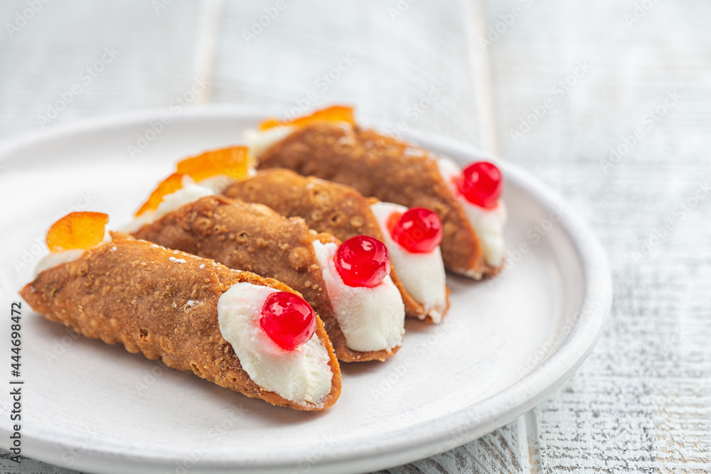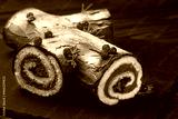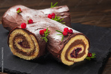 Traditional homemade Christmas cake. Yule log or Buche de Noel. Sponge cake with chocolate cream, ganache, decorated with cranberries Dark wooden background.