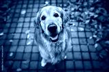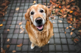 happy golden retriever sitting outdoors in autumn, top view portrait