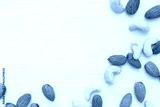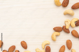 俯瞰のアーモンドとカシューナッツの右下のフレームと木目の背景