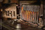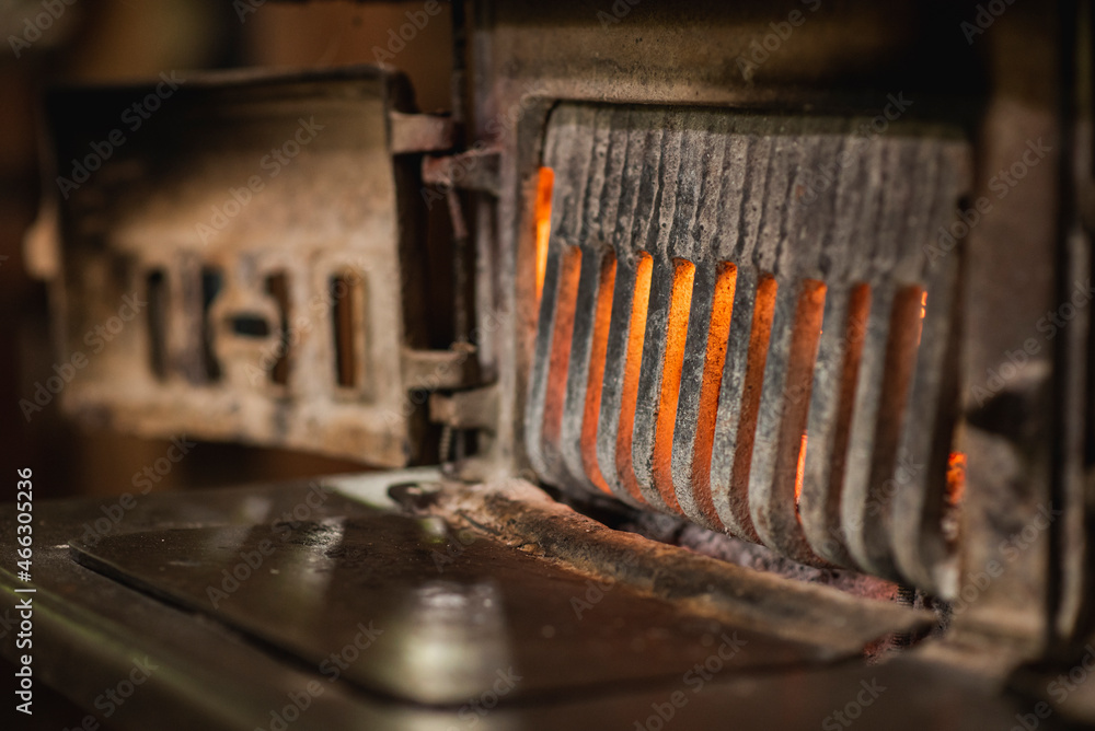 estufa antigua encendida con madera quemándose a una alta temperatura
