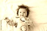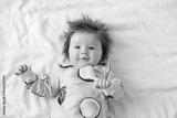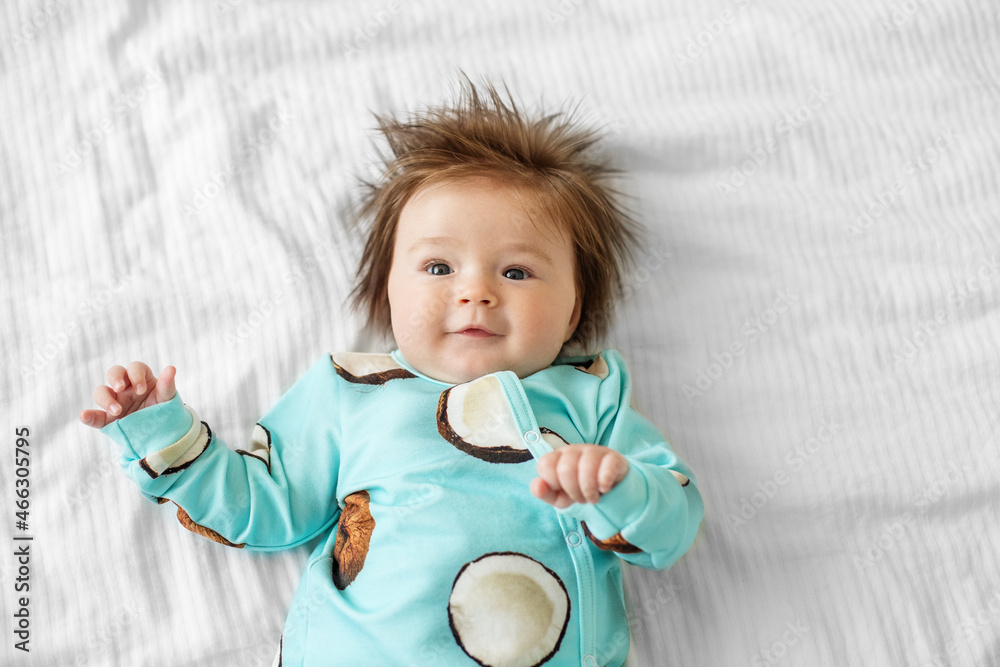 Infant 3 months old. A beautiful newborn baby girl lies on a white sheet. The baby is playing