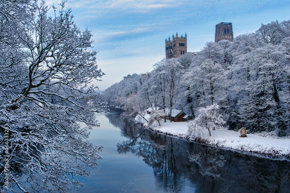 Durham Cathedral Towering over the River Wear with Frozen Trees. Durham City, County Durham England, UK.