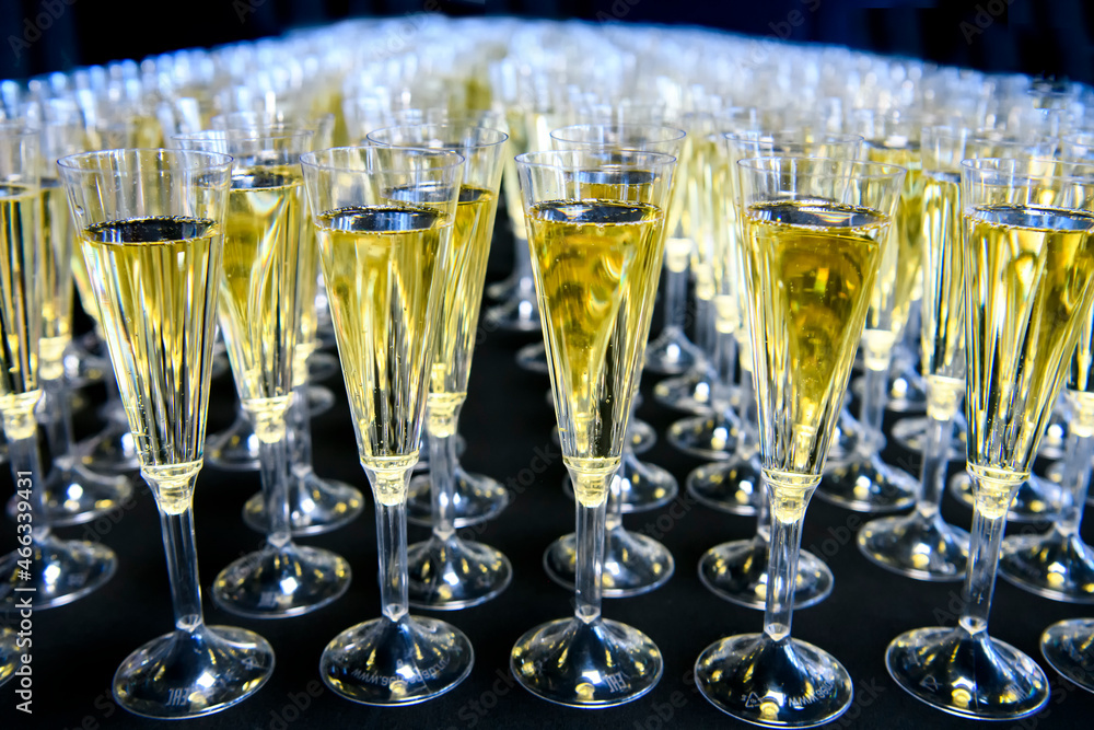 Lots of glasses with sparkling wine or champagne on a dark background. Holiday party mood.
