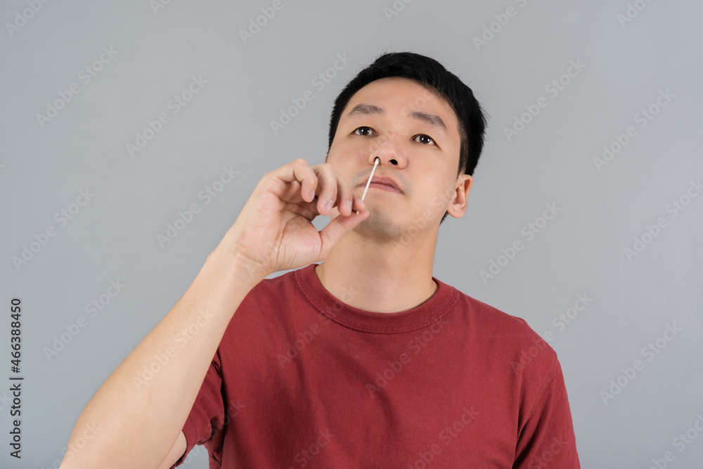 man using coronavirus(covid-19) rapid antigen self test kit (atk) at home with cotton nasal swab