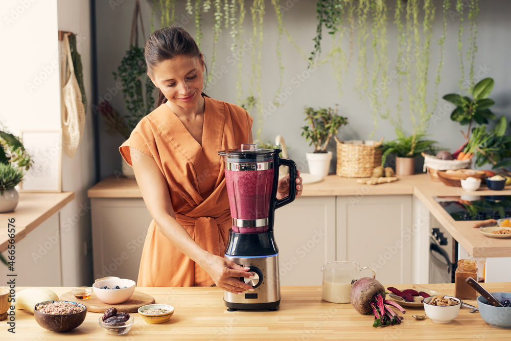 Young female pressing start button of blender during preparation of homemade vegetable smoothie by kitchen table