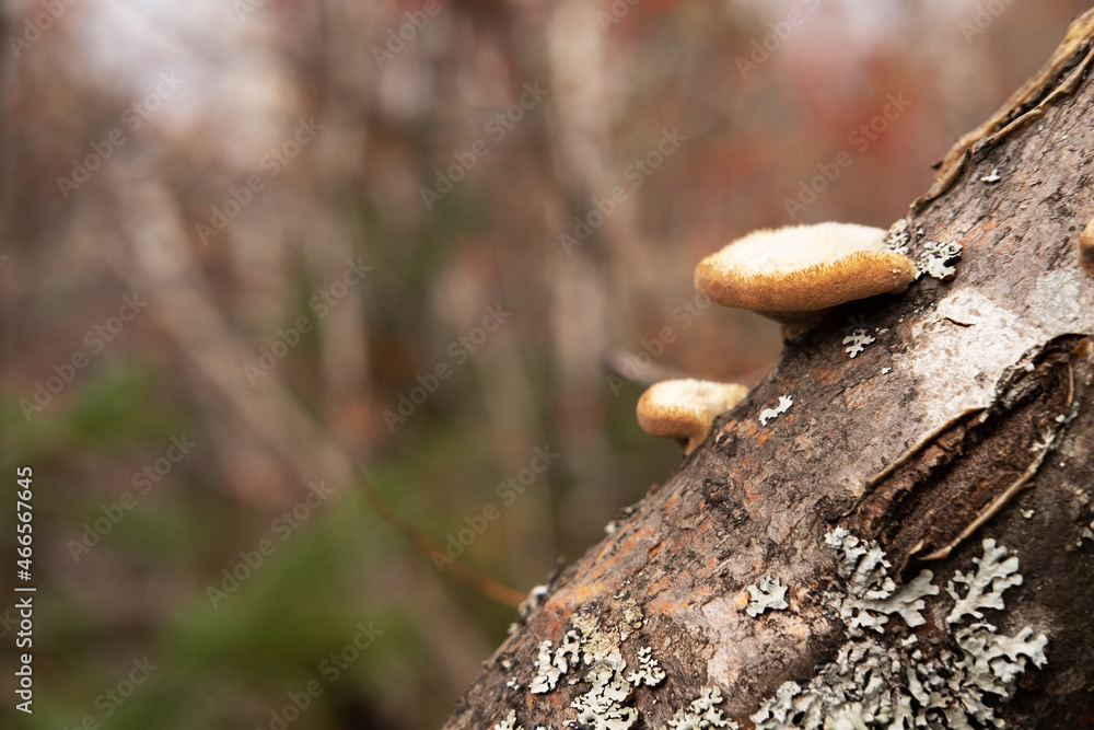A moss-covered tree trunk overgrown with mushrooms on the bark.