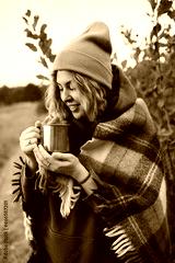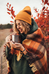 Young woman drinking hot tea from thermos in beautiful autumn forest.