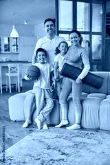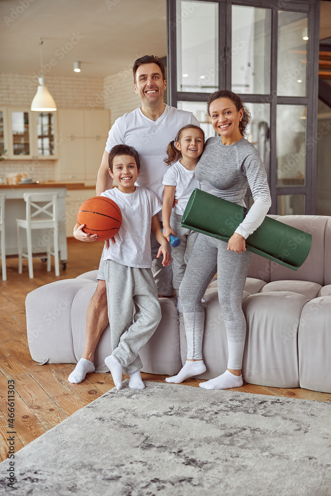 Full length portrait of happy parents with son and daughter standing in living room with equipment for training