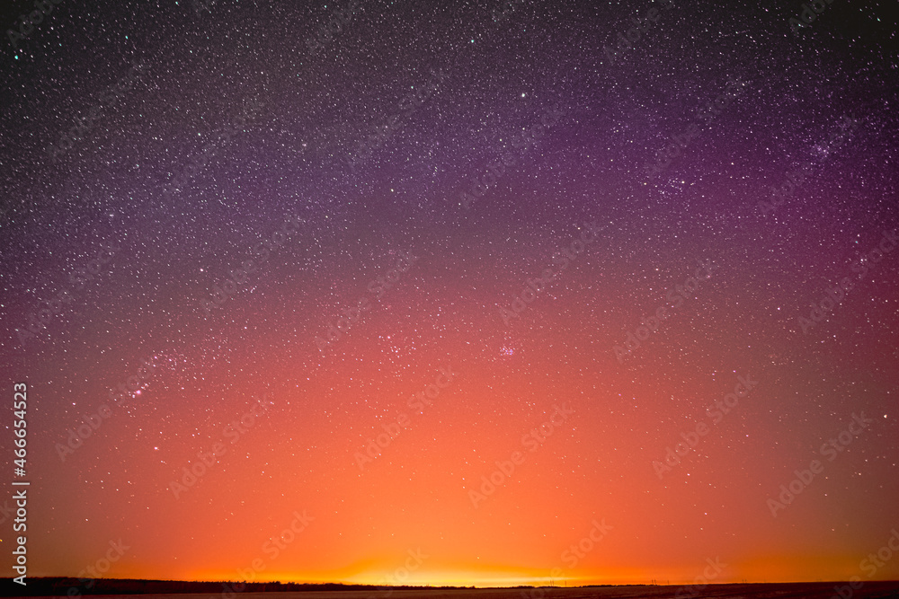 Night Sky Stars Background Backdrop. Colorful Sky Gradient. Sunset, Sunrise Lights And Colourful Night Starry Sky In Yellow Pink Magenta Orange Purple Colors. Copy Space