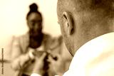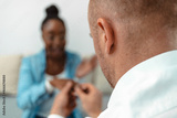 Shot of a young man proposing to his his girlfriend at home. Selective focus of young handsome bearded hipster man with engagement ring making proposal to his beautiful black woman at his home office.