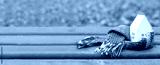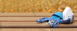 white paper house wrapped in a knitted blue scarf on a wooden surface. protection from cold in autumn