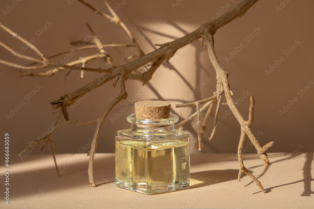 Square bottle of cosmetic oil among dry branches of tree, in rays of sunlight. Monochrome beige background with sun glare. Concept of spa care, natural cosmetics