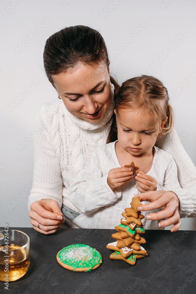 Mother with child decorating gingerbread cookies with icing for Christmas. Homemade festive food. Cute toddler girl Family Workshop. Stars, tree