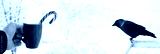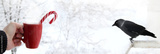 hand with a striped lollipop in a mug and a black bird on the background of a snowy landscape. winter holiday interest