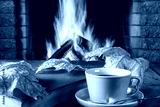 A cup of tea or coffee and yellow autumn leaves near a cozy fireplace, in a country house.