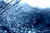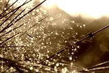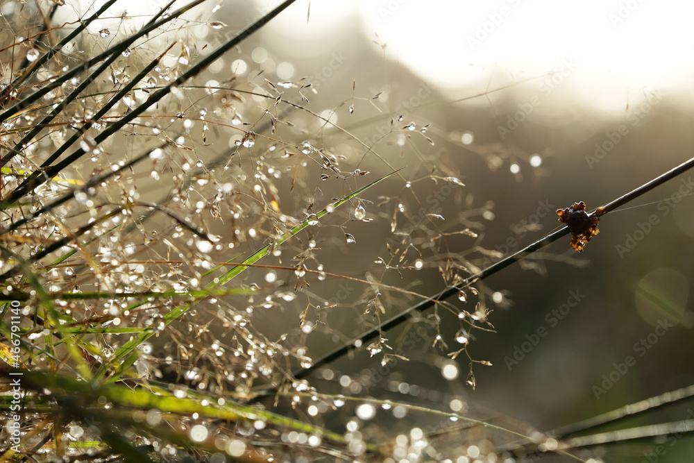 Źdźbła trawy z kroplami rosy w promieniach porannego słońca.
