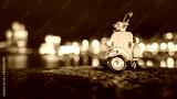 Vintage yellow toy motorcycle in front of the port of La Rochelle at night