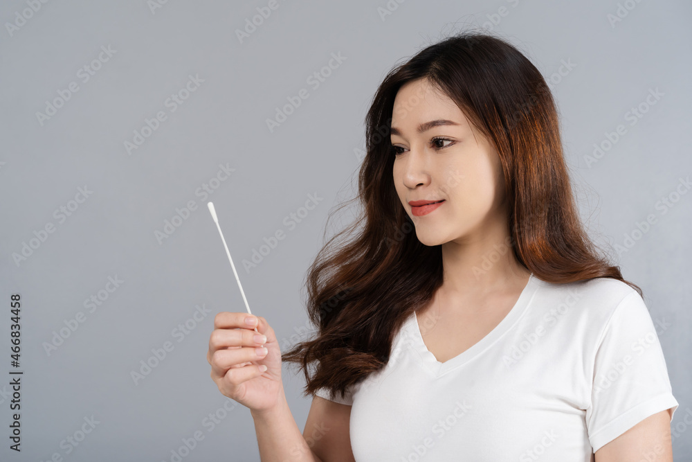 woman using coronavirus(covid-19) rapid antigen self test kit (atk) at home with cotton nasal swab