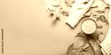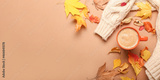 Autumn composition with cup of coffee, sweater and leaves on color background