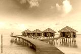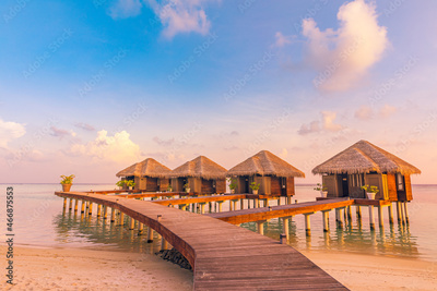 Sunset on Maldives island, luxury water villas resort hotel and wooden pier. Colorful sky and clouds and beach background for summer vacation holiday, traveling destination. Paradise sunset landscape