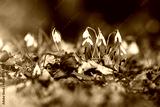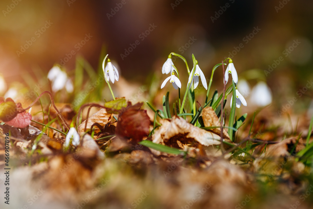 Ground level view of lovely snowdrop in the woods.