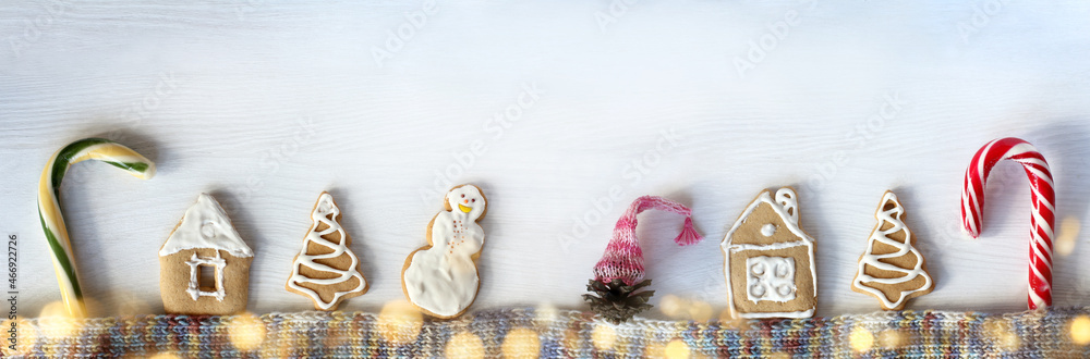 long knitted scarf with garland lights and curly decorations. sweet winter holiday landscape