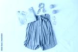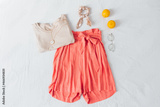 Summer female fashion stylish composition. Shorts, t shirt, lemons, glasses, scrunchie and necklace on white messy bed sheet background. Flat lay, top view.