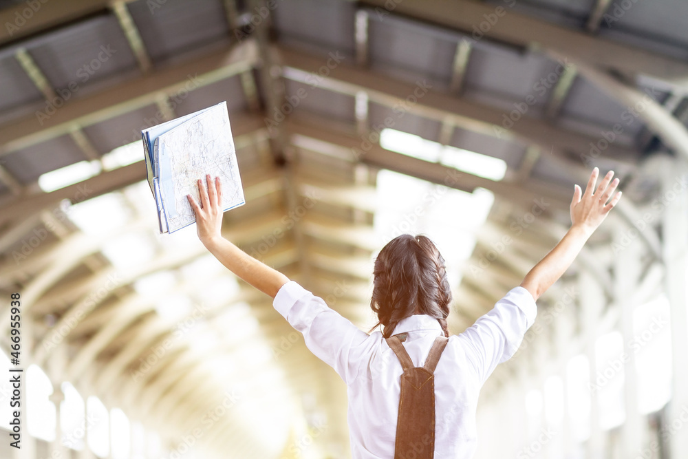 Asian woman Hands up hold the map at railway station travel,traveler with backpack in summer Holiday concept Thailand