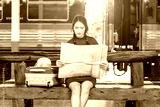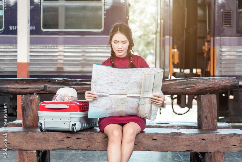 Asian woman pregnant in red dress carrying red luggage and look at the map at railway station travel,traveler with backpack in summer Holiday concept Thailand