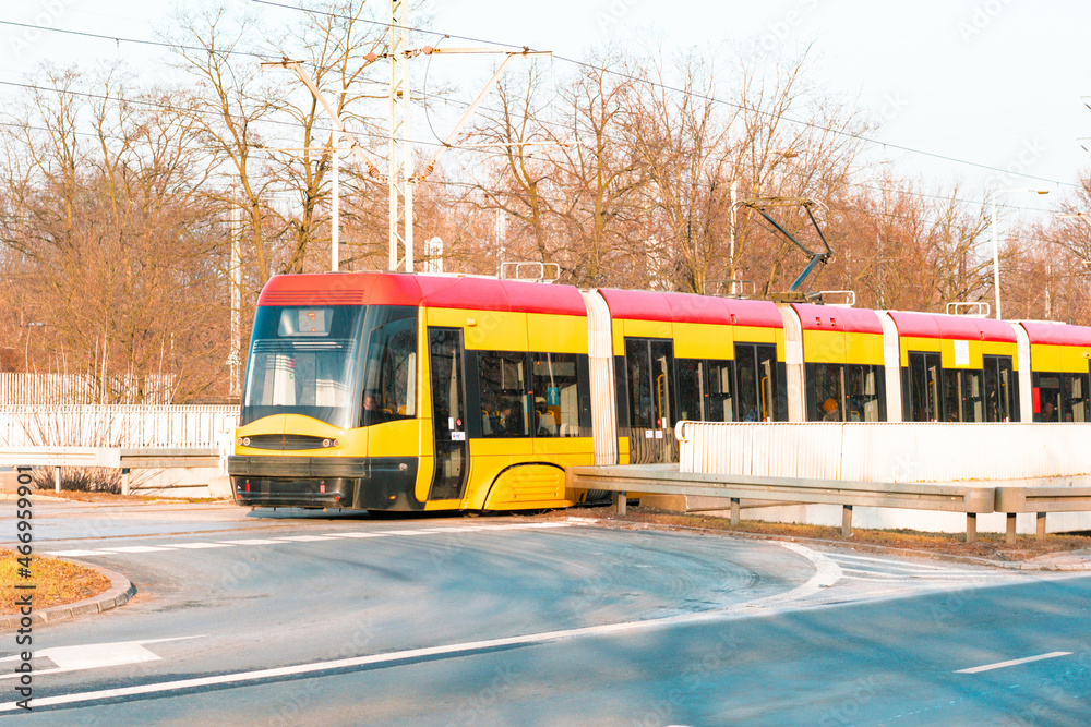 Yellow and red tram on the city street at autumn. Leafs. Fall. Trees. Outdoor. Transportation. Long. Sustainable. Public transport. Urban. Eco