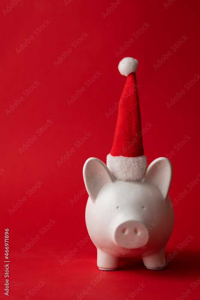 Christmas saving, White piggy bank money box wearing a red santa claus hat