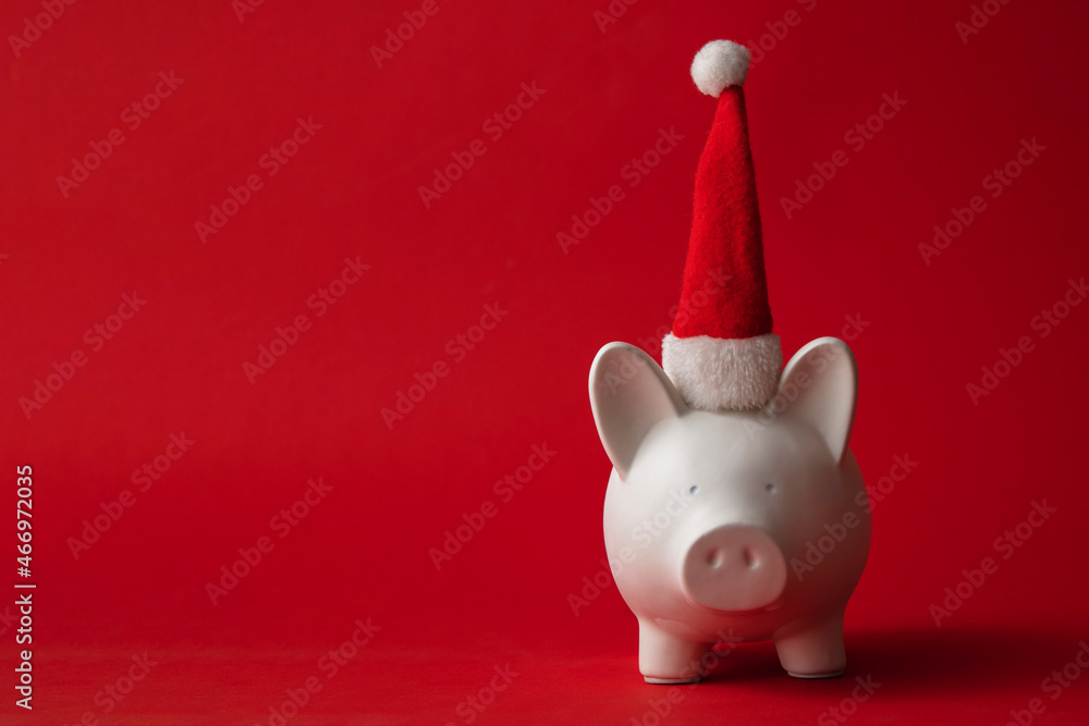 Christmas saving, White piggy bank money box wearing a red santa claus hat