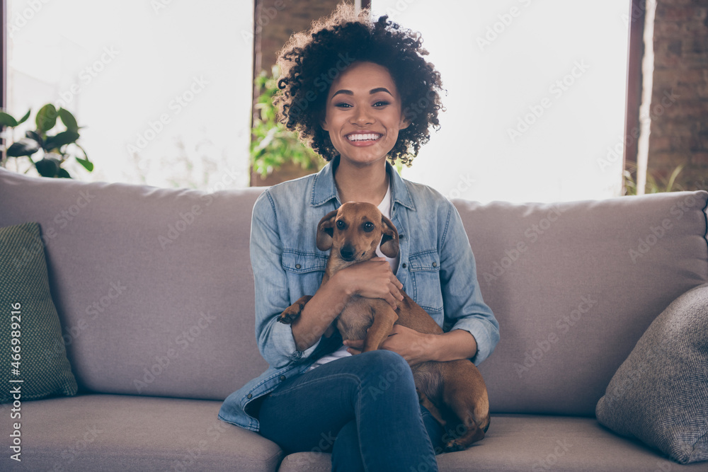Photo of young cheerful african couple happy positive smile hug animal pet best friend dog sit couch indoors
