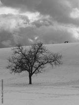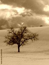 Bare tree in winter standing on a hill surrounded by a white blanket of snow in Southern Black Forest in Germany