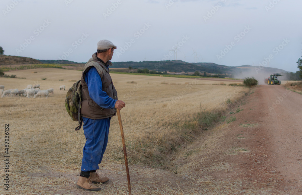 Shepherd grazing a flock of sheep in a field. On the edge of the dusty road.