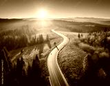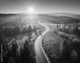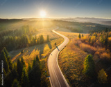 Aerial view of mountain road in forest at sunset in autumn. Top view from drone of road in woods. Beautiful landscape with roadway in hills, pine trees, green meadows, golden sunlight in fall. Travel