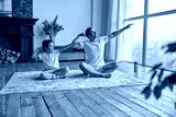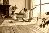 Merry little boy is training with shaply dad on mat at home and demonstrating muscles
