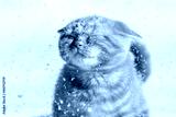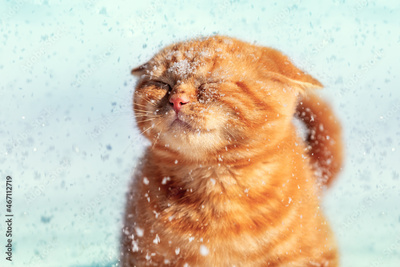 Portrait of a British shorthair ginger kitten walking on the snow in winter during snowfall