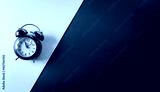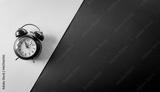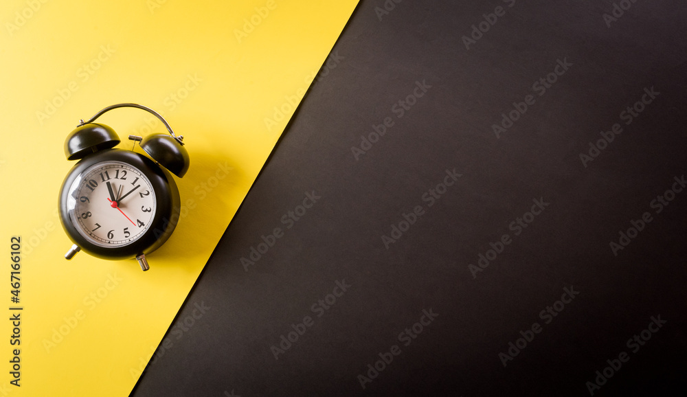 Top view of black alarm clock on yellow and black background. Shopping concept boxing day and Black Friday composition.