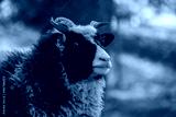 portrait of a black and white four horned Jacob sheep looking at camera while standing in the field