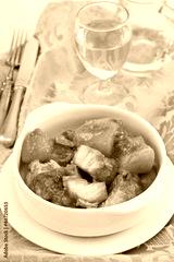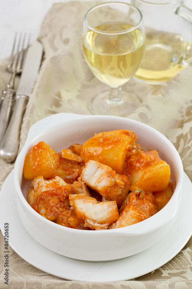 fish stew in the white bowl with wine
