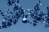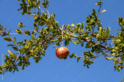 Pomegranate on tree branch in front of blue sky