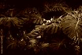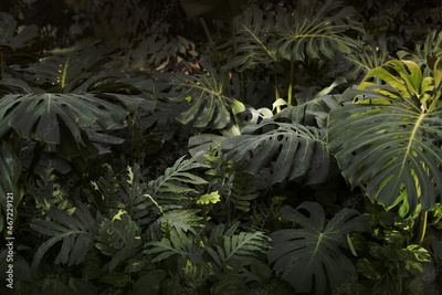 Tropical monstera plants leaf. Nature dark green background. Film color.