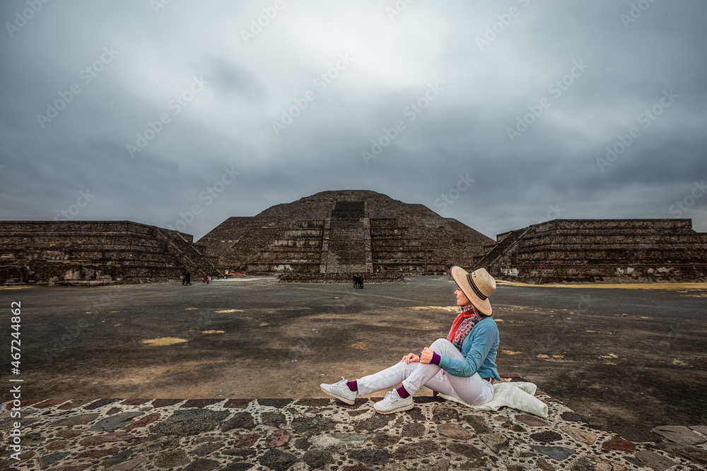 A girl in a hat sits near the ancient pyramid of the Teotihuacan moon. Mexico