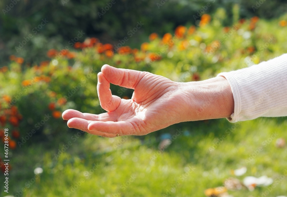 Elderly woman is hand performing yoga exercises. Help yourself.