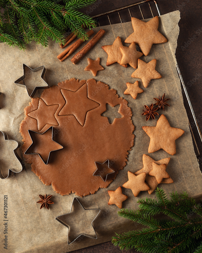 Christmas gingerbread dough in the cooking process on a dark background. top view
