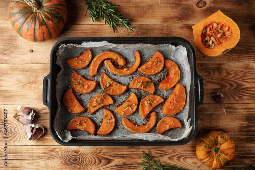 Traditional autumn dishes from pumpkin. On a baking sheet, on a rustic wooden old table. Top view copy space