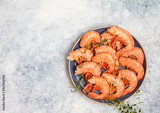 Raw red Argentine shrimps on ceramic plate, blue concrete background. Ocean jumbo shrimps. Top view.