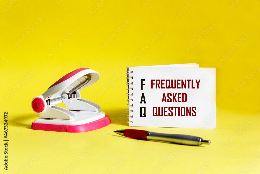 FAQ text, frequently asked questions, on a notepad, on a yellow background with a stapler