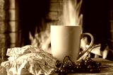 Blue Mug with tea ,berries and yellow autumn leaves near a cozy fireplace, in a country house.